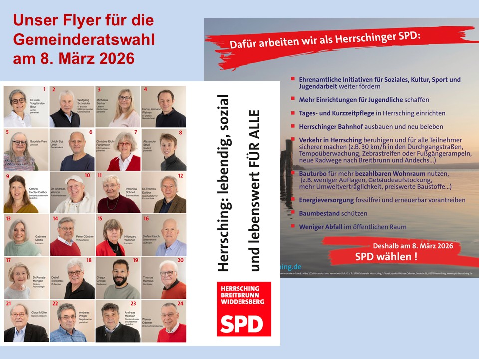 Wir freuen uns über Ihren Besuch auf der Internetseite der SPD Herrsching. Sie können sich nun auch auf diesem Weg über unsere Arbeit informieren.