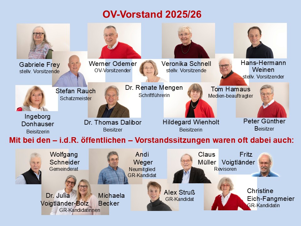 Im Anschluss wählten die anwesenden 16 Mitglieder des Ortsvereins ihren neuen Vorstand. Als Erster Vorsitzender wurde erwartungsgemäß wieder Werner Odemer einstimmig gewählt. Als seine Stellvertreter*innen wurden Gabriele Frey und Veronika Schnell mit je 16 Stimmen sowie Hans-Hermann Weinen mit 15 Stimmen bestätigt. Einstimmig bestätigt wurden auch Stefan Rauch als Kassier und Renate Mengen als Schriftführerin. Der bisherige Pressereferent Tom Hamaus trat aus Altersgründen nicht mehr zur Wiederwahl an, ebenso die bisherige Beisitzerin Hildegard Wienholt. Die Funktion des Medienbeauftragten wird künftig der stellvertretende Vorstand Hans-Hermann Weinen wahrnehmen. Als neue Beisitzer erhielten Thomas Dalibor, Ingeborg Donhauser, Peter Günther und Andreas Weger allesamt je 16 Stimmen. Als Revisoren stehen künftig Fritz Voigtländer (wie bisher schon) und Tom Hamaus (neu) zur Verfügung.
