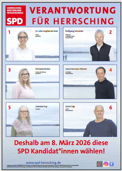 - Diese 6 Spitzenkandidat*innen der SPD wollen im nächsten Gemeinderat Verantwortung für soziale Kommunalpolitik für Herrsching tragen:25. Februar 2026 - 0:05